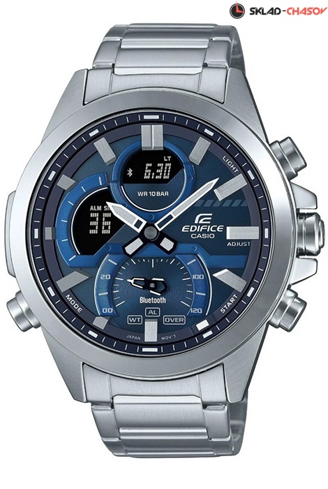 Мужские кварцевые часы Casio ECB-30D-2A коллекции Edifice с технологией Bluetooth®. Калибр механизма — 5686. С помощью Bluetooth® вы можете подключить часы к смартфону и получить доступ к полезным функциям. Часы автоматически связываются с телефоном через Bluetooth® и проверяют точность времени 4 раза в сутки. Возможности Bluetooth в данной модели: С помощью специального приложения CASIO WATCHES возможно установить время в конкретном городе (300 городов), установить точное текущее время, установить будильник, просмотреть показания секундомера, подстроить положение стрелок. Функция поиска телефона, можно включить тоновый сигнал на телефоне, что позволит быстро найти телефон. Функциональность данной модели: формат времени 12/24; мировое время в 38 городах (в 38 часовых поясах); вечный календарь до 2099 года (с возможностью отображения дня недели на одном из 6 языков, в том числе и на Русском языке), функция летнего времени (DST); 5 независимых будильников и сигнал начала часа; секундомер с точностью 1/1000 секунды (для первых 60 минут), 1/10 секунды (после 60 минут); таймер обратного отсчета (диапазон времени 24 часа); функция выключения звука нажатия кнопок (Mute); функция ручного перемещения стрелок (стрелки перемещаются в сторону, чтобы обеспечить беспрепятственный просмотр содержимого цифрового дисплея); функция "авиа режим"; функция сигнала по расписанию. Стрелки и метки покрыты необритовым (Neobrite) люминесцентным напылением (светятся в темноте). Полностью автоматическая двойная диодная подсветка циферблата (включается при недостаточном освещении и при наклоне часов на 40°) с возможностью выбора времени свечения (1.5 или 3 секунды). Стальной браслет. Водонепроницаемость WR100 (10 атм).