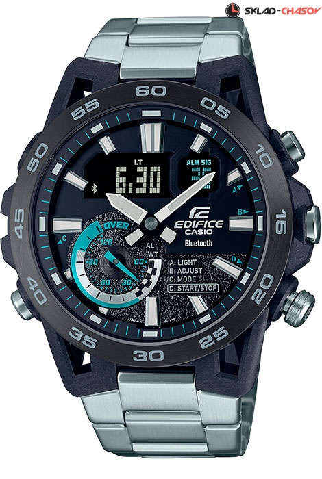 Кварцевые мужские наручные часы Casio ECB-40DB-1A коллекции Edifice с технологией Bluetooth® Smart. Двойная (цифровая+аналоговая) индикация времени. Модельный ряд Sospensione, вдохновленный подвеской Formula Car. Калибр механизма — 5708. С помощью Bluetooth® вы можете подключить часы к смартфону и получить доступ к полезным функциям. Часы автоматически связываются с телефоном через Bluetooth® и проверяют точность времени 4 раза в сутки. Возможности Bluetooth в данной модели: С помощью специального приложения CASIO WATCHES возможно установить время в конкретном городе (300 городов), установить точное текущее время, установить будильник, просмотреть показания секундомера, подстроить положение стрелок, записать данные о времени и местоположении (TIME & PLACE). Функция поиска телефона - можно включить тоновый сигнал на телефоне, что позволит быстро найти телефон. Функциональность данной модели: формат времени 12/24; индикация даты и дня недели (в том числе на Русском языке); мировое время в 38 городах (в 38 часовых поясах); двойное время; вечный календарь до 2099 года; 5 ежедневных будильников; сигнал начала часа; секундомер с измерением до 23 часов 59 минут 59 cек; таймер обратного отсчета (диапазон времени 24 часа), Двойная диодная подсветка циферблата с функцией авто (включается при наклоне часов на 40°) и возможностью выбора времени свечения (1.5 или 3 секунды); функция выключения звука нажатия кнопок (Mute). Функция ручного перемещения стрелок (стрелки перемещаются в сторону, чтобы обеспечить беспрепятственный просмотр содержимого цифрового дисплея). Стрелки и метки покрыты необритовым (Neobrite) люминесцентным напылением (светятся в темноте). Стальной корпус усиленный карбоном. Стальной браслет. На стальную часть корпуса нанесено стойкое PVD покрытие. Водонепроницаемость WR100 (10 атм).