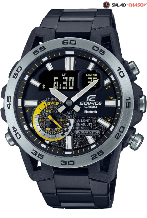 Кварцевые мужские наручные часы Casio ECB-40DC-1A коллекции Edifice с технологией Bluetooth® Smart. Двойная (цифровая+аналоговая) индикация времени. Модельный ряд Sospensione, вдохновленный подвеской Formula Car. Калибр механизма — 5708. С помощью Bluetooth® вы можете подключить часы к смартфону и получить доступ к полезным функциям. Часы автоматически связываются с телефоном через Bluetooth® и проверяют точность времени 4 раза в сутки. Возможности Bluetooth в данной модели: С помощью специального приложения CASIO WATCHES возможно установить время в конкретном городе (300 городов), установить точное текущее время, установить будильник, просмотреть показания секундомера, подстроить положение стрелок, записать данные о времени и местоположении (TIME & PLACE). Функция поиска телефона - можно включить тоновый сигнал на телефоне, что позволит быстро найти телефон. Функциональность данной модели: формат времени 12/24; индикация даты и дня недели (в том числе на Русском языке); мировое время в 38 городах (в 38 часовых поясах); двойное время; вечный календарь до 2099 года; 5 ежедневных будильников; сигнал начала часа; секундомер с измерением до 23 часов 59 минут 59 cек; таймер обратного отсчета (диапазон времени 24 часа), Двойная диодная подсветка циферблата с функцией авто (включается при наклоне часов на 40°) и возможностью выбора времени свечения (1.5 или 3 секунды); функция выключения звука нажатия кнопок (Mute). Функция ручного перемещения стрелок (стрелки перемещаются в сторону, чтобы обеспечить беспрепятственный просмотр содержимого цифрового дисплея). Стрелки и метки покрыты необритовым (Neobrite) люминесцентным напылением (светятся в темноте). Стальной корпус усиленный карбоном. Стальной браслет. На браслет нанесено стойкое PVD покрытие. Водонепроницаемость WR100 (10 атм).