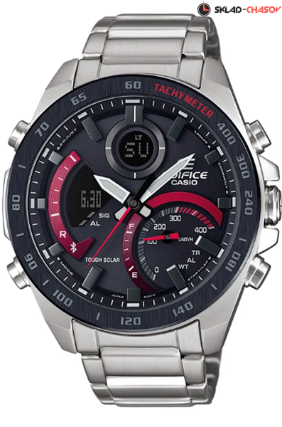 Кварцевые наручные часы на солнечной батарее Casio ECB-900DB-1A коллекции Edifice с технологией Bluetooth®. Калибр механизма — 5582. Аккумулятор данной модели заряжается от любого источника света. Аккумулятор данной модели заряжается от любого источника света. Срок работы аккумулятора с полным зарядом — около 5-ти месяцев. Примерный срок службы аккумулятора — 10 лет. Имеется режим энергосбережение (дисплей гаснет для экономии энергии, когда часы остаются в темноте) и индикатор уровня заряда батареи. С помощью Bluetooth® вы можете подключить часы к смартфону и получить доступ к полезным функциям. Часы автоматически связываются с телефоном через Bluetooth® и проверяют точность времени 4 раза в сутки. Возможности Bluetooth в данной модели: С помощью специального приложения EDIFICE Connected возможно установить время в конкретном городе (300 городов), установить точное текущее время, установить будильник, просмотреть показания секундомера, подстроить положение стрелок, проверить уровень заряда аккумулятора. Функция поиска телефона, можно включить тоновый сигнал на телефоне, что позволит быстро найти телефон. Функциональность данной модели: отображение времени в 12-часовом или 24-часовом формате; индикация даты и дня недели (в том числе на Русском языке); вечный календарь до 2099 года; мировое время в 39 городах (39 часовых поясов); функция летнего времени (DST); 5 независимых будильников и сигнал начала часа; секундомер с точностью 1/1000 секунды и измерением до 23 часов 59 минут 59 cек. и записью результатов (до 200 записей); отображение скорости (Можно рассчитать среднюю скорость пройденного маршрута); таймер обратного отсчета с точностью 1/10 сек. (диапазон времени 24 часа); функция принудительного перемещения стрелок (стрелки перемещаются в сторону, чтобы обеспечить беспрепятственный просмотр содержимого цифрового дисплея), режим полета (авиа режим); функция выключения звука нажатия кнопок (Mute). Двойная диодная подсветка циферблата с функцией авто (включается при наклоне часов на 40°) и возможностью выбора времени свечения (1.5 или 3 секунды) + необритовое (Neobrite) покрытие на стрелках для длительного послесвечения в темноте. На безеле присутствует шкала тахиметра для измерения средней скорости движения. На корпус частично нанесено стойкое PVD покрытие. Стальной браслет. Водонепроницаемость WR100 (10 атм).