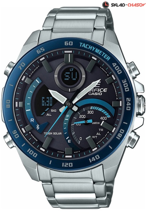 Кварцевые наручные часы на солнечной батарее Casio ECB-900DB-1B коллекции Edifice с технологией Bluetooth®. Калибр механизма — 5582. Аккумулятор данной модели заряжается от любого источника света. Аккумулятор данной модели заряжается от любого источника света. Срок работы аккумулятора с полным зарядом — около 5-ти месяцев. Примерный срок службы аккумулятора — 10 лет. Имеется режим энергосбережение (дисплей гаснет для экономии энергии, когда часы остаются в темноте) и индикатор уровня заряда батареи. С помощью Bluetooth® вы можете подключить часы к смартфону и получить доступ к полезным функциям. Часы автоматически связываются с телефоном через Bluetooth® и проверяют точность времени 4 раза в сутки. Возможности Bluetooth в данной модели: С помощью специального приложения EDIFICE Connected возможно установить время в конкретном городе (300 городов), установить точное текущее время, установить будильник, просмотреть показания секундомера, подстроить положение стрелок, проверить уровень заряда аккумулятора. Функция поиска телефона, можно включить тоновый сигнал на телефоне, что позволит быстро найти телефон. Функциональность данной модели: отображение времени в 12-часовом или 24-часовом формате; индикация даты и дня недели (в том числе на Русском языке); вечный календарь до 2099 года; мировое время в 39 городах (39 часовых поясов); функция летнего времени (DST); 5 независимых будильников и сигнал начала часа; секундомер с точностью 1/1000 секунды и измерением до 23 часов 59 минут 59 cек. и записью результатов (до 200 записей); отображение скорости (Можно рассчитать среднюю скорость пройденного маршрута); таймер обратного отсчета с точностью 1/10 сек. (диапазон времени 24 часа); функция принудительного перемещения стрелок (стрелки перемещаются в сторону, чтобы обеспечить беспрепятственный просмотр содержимого цифрового дисплея), режим полета (авиа режим); функция выключения звука нажатия кнопок (Mute). Двойная диодная подсветка циферблата с функцией авто (включается при наклоне часов на 40°) и возможностью выбора времени свечения (1.5 или 3 секунды) + необритовое (Neobrite) покрытие на стрелках для длительного послесвечения в темноте. На безеле присутствует шкала тахиметра для измерения средней скорости движения. На корпус частично нанесено стойкое PVD покрытие. Стальной браслет. Водонепроницаемость WR100 (10 атм).