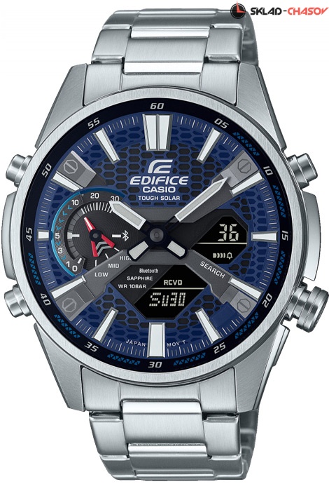 Кварцевые наручные часы на солнечной батарее Casio ECB-S100D-2F коллекции Edifice с технологией Bluetooth®. Калибр механизма — 5658. Аккумулятор данной модели заряжается от любого источника света. Аккумулятор данной модели заряжается от любого источника света. Срок работы аккумулятора с полным зарядом — около 5-ти месяцев. Примерный срок службы аккумулятора — 10 лет. Имеется режим энергосбережение (дисплей гаснет для экономии энергии, когда часы остаются в темноте) и индикатор уровня заряда батареи. С помощью Bluetooth® вы можете подключить часы к смартфону и получить доступ к полезным функциям. Часы автоматически связываются с телефоном через Bluetooth® и проверяют точность времени 4 раза в сутки. Возможности Bluetooth в данной модели: С помощью специального приложения EDIFICE Connected возможно установить время в конкретном городе (300 городов), установить точное текущее время, установить будильник, просмотреть показания секундомера, подстроить положение стрелок, проверить уровень заряда аккумулятора. Функция поиска телефона, можно включить тоновый сигнал на телефоне, что позволит быстро найти телефон. Функциональность данной модели: отображение времени в 12-часовом или 24-часовом формате; индикация даты и дня недели (в том числе на Русском языке); вечный календарь до 2099 года; мировое время в 38 городах (38 часовых поясов); функция летнего времени (DST); 5 независимых будильников и сигнал начала часа; секундомер с точностью 1/100 секунды и измерением до 23 часов 59 минут 59 cек.; таймер обратного отсчета с точностью 1 сек. (диапазон времени 1 час); функция принудительного перемещения стрелок (стрелки перемещаются в сторону, чтобы обеспечить беспрепятственный просмотр содержимого цифрового дисплея), режим полета (авиа режим); функция выключения звука нажатия кнопок (Mute). Двойная диодная подсветка циферблата с возможностью выбора времени свечения (1.5 или 3 секунды) + необритовое (Neobrite) покрытие на стрелках для длительного послесвечения в темноте. Устойчивое к возникновению царапин сапфировое стекло с антибликовым покрытием. Водонепроницаемость WR100 (10 атм).