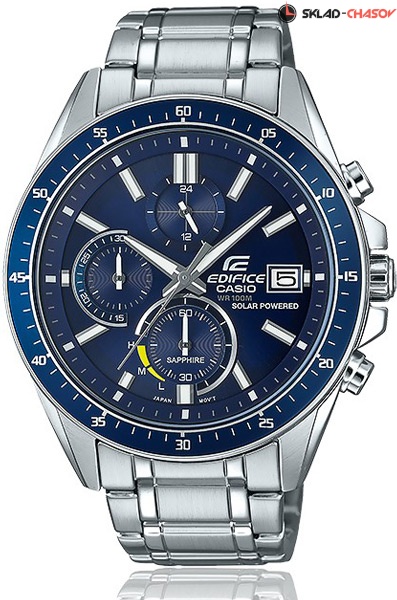 Мужские кварцевые наручные часы с хронографом (секундомером) Casio EFS-S510D-2A на солнечной батарее. Коллекция Edifice. Калибр механизма — 5529. Срок работы аккумулятора с полным зарядом — около 5-ти месяцев. Примерный срок службы аккумулятора — 10 лет. Присутствует функция информирования о недостаточном заряде и индикатор степени заряда аккумулятора. На данной модели отображается дата и время суток (24 часа). Секундомер может отсчитывать до 29 минут 59 секунд. Стрелки и метки покрыты люминесцентным напылением (светятся в темноте). Установлено сапфировое стекло устойчивое к царапинам. Водонепроницаемость WR100 (10 атм). Завинчивающаяся задняя крышка.