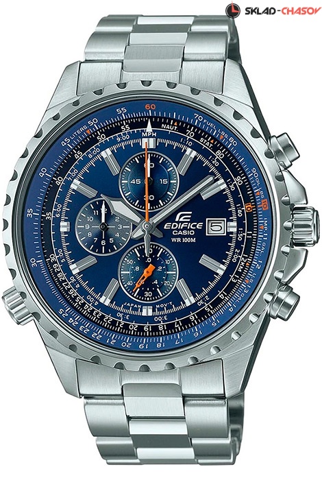 Мужские кварцевые наручные часы с хронографом (секундомером) Casio EF-527D-2A коллекции Edifice. Калибр механизма — 4369. На данной модели отображается дата. Секундомер может отсчитывать до 11 часов 59 минут 59 секунд с шагом 1/20 сек. Внутренний вращающийся безель с логарифмической линейкой. Стрелки и метки покрыты люминесцентным напылением (светятся в темноте). Водонепроницаемость WR100 (10 атм). Завинчивающаяся заводная головка и задняя крышка для более уверенной водонепроницаемости часов.