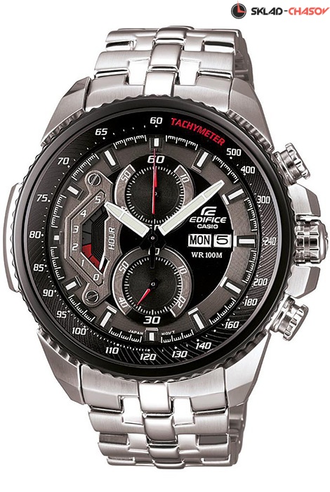 Мужские кварцевые наручные часы с хронографом (секундомером) Casio EF-558D-1A коллекции Edifice. Калибр механизма — 5177. На данной модели отображается день недели и текущая дата. Секундомер может отсчитывать до 5 часов с шагом 1 сек. На циферблате присутствует шкала тахиметра для измерения средней скорости движения. Стрелки и метки покрыты люминесцентным напылением (светятся в темноте). Завинчивающаяся задняя крышка и заводная головка. На корпус частично нанесено стойкое PVD покрытие. Стальной браслет. Водонепроницаемость WR100 (10 атм).