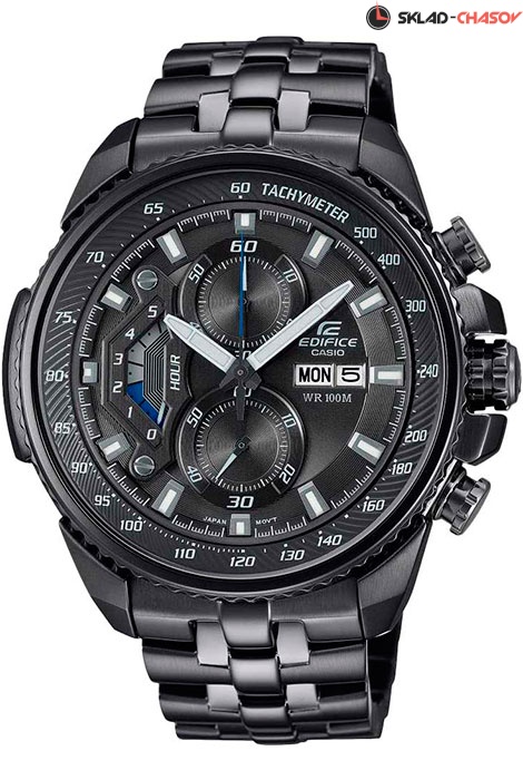 Мужские кварцевые наручные часы с хронографом (секундомером) Casio EF-558DC-1A коллекции Edifice. Калибр механизма — 5177. На данной модели отображается день недели и текущая дата. Секундомер может отсчитывать до 5 часов с шагом 1 сек. На циферблате присутствует шкала тахиметра для измерения средней скорости движения. Стрелки и метки покрыты люминесцентным напылением (светятся в темноте). Завинчивающаяся задняя крышка и заводная головка. На корпус и браслет нанесено стойкое PVD покрытие. Стальной браслет. Водонепроницаемость WR100 (10 атм).
