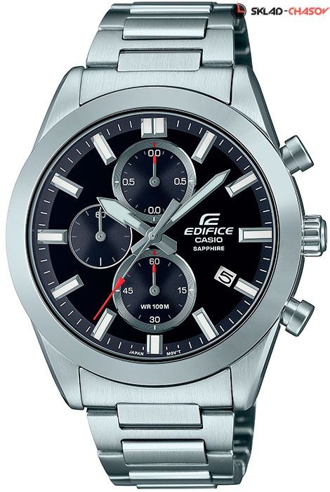 Мужские кварцевые наручные часы с хронографом (секундомером) Casio EFB-710D-1A. Коллекция Edifice. Калибр механизма — 5579. На данной модели отображается дата. Секундомер может отсчитывать до 59 минут 59 секунд с точностью 1/10 секунды. Стрелки и метки покрыты люминесцентным напылением (светятся в темноте). Сапфировое стекло, устойчивое к появлению царапин. Завинчивающаяся задняя крышка. Стальной браслет. Водонепроницаемость WR100 (10 атм).