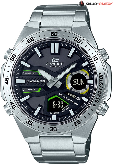 Кварцевые мужские наручные часы Casio EFV-C110D-1A3 с аналоговой + цифровой индикацией времени. Калибр механизма — 5699. Функциональность данной модели: формат времени 12/24, функция летнего времени (DST), мировое время 30 городов (29 часовых поясов), вечный календарь до 2099 года, 3 независимых будильника, сигнал начала часа, секундомер с точностью 1/100 секунды и измерением до 23 часов 59 минут 59,99 cек., таймер обратного отсчета (диапазон времени 24 часа), записная книжка телефонных номеров на 30 записей, люминесцентное напыление на стрелках и метках часов (светятся в темноте). Батарейка на 10 лет работы. Водонепроницаемость WR100 (10 атм).