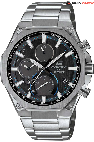 Кварцевые наручные часы на солнечной батарее Casio EQB-1100D-1A коллекции Edifice с модулем Bluetooth Smart. Тонкий корпус — 8.9 мм. Калибр механизма — 5639. С помощью технологии Bluetooth Smart данная модель имеет возможность поддерживать связь с системами IOS и Android. Возможности Bluetooth в данной модели: С помощью специального приложения Edifice Connected возможно установить время в конкретном городе (300 городов), время будильника, воспользоваться секундомером и просмотреть результаты показаний секундомера, установить точное текущее время, а также в случае потери смартфона возможно воспроизвести на нем сигнал. Функциональность данной модели: режим сохранения энергии; функция информирования о недостаточном заряде аккумулятора; индикация даты, дня недели и времени суток (24-х часовая шкала); ежедневная автоматическая корректировка точного времени по Bluetooth; вечный календарь; будильник; двойное время; секундомер с точностью 1/1000 секунды, измерением до 23 часов 59 минут 59 cек. и записью результатов (до 200 кругов); функция "Авиарежим". Стрелки и метки покрыты люминесцентным напылением (светятся в темноте). Водонепроницаемость WR100 (10 атм).