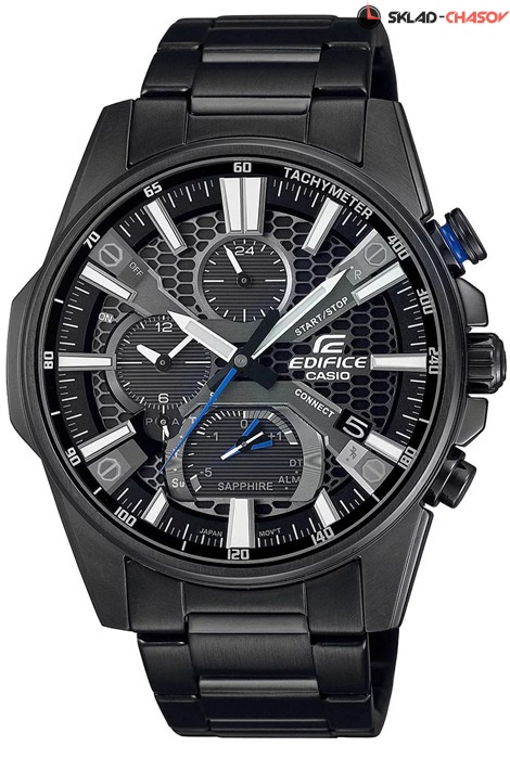 Кварцевые наручные часы на солнечной батарее Casio EQB-1200DC-1A коллекции Edifice с модулем Bluetooth Smart. Калибр механизма — 5666. С помощью технологии Bluetooth Smart данная модель имеет возможность поддерживать связь с системами IOS и Android. Возможности Bluetooth в данной модели: С помощью специального приложения Edifice Connected возможно установить время в конкретном городе (300 городов), время будильника, воспользоваться секундомером и просмотреть результаты показаний секундомера, установить точное текущее время, а также в случае потери смартфона возможно воспроизвести на нем сигнал. Функциональность данной модели: режим сохранения энергии; функция информирования о недостаточном заряде аккумулятора; индикация даты, дня недели и времени суток (24-х часовая шкала); ежедневная автоматическая корректировка точного времени по Bluetooth; вечный календарь; будильник; двойное время; секундомер с точностью 1/1000 секунды, измерением до 23 часов 59 минут 59 cек. и записью результатов (до 200 кругов); функция "Авиарежим". Функция поиска телефона, можно включить тоновый сигнал на телефоне, что позволит быстро найти телефон. Стрелки и метки покрыты люминесцентным напылением (светятся в темноте). Сапфировое стекло. На циферблате присутствует шкала тахиметра для измерения средней скорости движения. На корпус и браслет нанесено стойкое PVD покрытие. Водонепроницаемость WR100 (10 атм).
