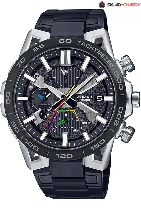 Кварцевые наручные часы на солнечной батарее Casio EQB-2000DC-1A коллекции Edifice с технологией Bluetooth® Smart. Флагманский хронограф Edifice, модель Sospensione. Калибр механизма — 5697. Аккумулятор данной модели заряжается от любого источника света. Срок работы аккумулятора с полным зарядом — около 6-ти месяцев. Примерный срок службы аккумулятора — 10 лет. Имеется режим энергосбережения (стрелки останавливаются для экономии энергии, когда часы остаются в темноте). С помощью Bluetooth® вы можете подключить часы к смартфону и получить доступ к полезным функциям. Часы автоматически связываются с телефоном через Bluetooth® и проверяют точность времени 4 раза в сутки. Возможности Bluetooth в данной модели: С помощью специального приложения CASIO WATCHES возможно установить время в конкретном городе (300 городов), установить точное текущее время, установить будильник, просмотреть показания секундомера, подстроить положение стрелок, записать данные о времени и местоположении (TIME & PLACE). Функция поиска телефона - можно включить тоновый сигнал на телефоне, что позволит быстро найти телефон. Функциональность данной модели: формат времени 12/24; мировое время; двойное время; индикация даты и времени суток (24-х часовая шкала); вечный календарь до 2099 года; будильник; секундомер с измерением до 23 часов 59 минут 59 cек с шагом 1 сек. с памятью на 200 кругов, с обратным ходом (прямой запуск отсчета времени из режима хронометража). Стрелки и метки покрыты люминесцентным напылением (светятся в темноте). Сапфировое стекло с антибликовым покрытием. На безеле часов присутствует шкала тахиметра для измерения средней скорости движения. Стальной литой браслет. На корпус частично, на браслет полностью нанесено стойкое PVD покрытие. Водонепроницаемость WR100 (10 атм).