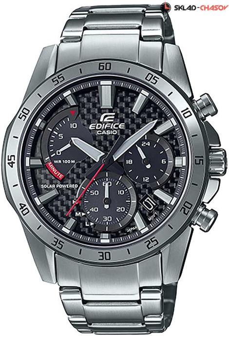 Мужские кварцевые наручные часы с хронографом (секундомером) Casio EQS-930D-1A на солнечной батарее. Коллекция Edifice. Калибр механизма — 5661. Срок работы аккумулятора с полным зарядом — около 5-ти месяцев. Примерный срок службы аккумулятора — 10 лет. Присутствует функция информирования о недостаточном заряде и индикатор степени заряда аккумулятора. На данной модели отображается дата и время суток (24 часа). Секундомер может отсчитывать до 9 минут 59 секунд с шагом 1 сек. Стрелки и метки покрыты люминесцентным напылением (светятся в темноте). Стальной браслет. Карбоновый циферблат. Завинчивающаяся задняя крышка. Водонепроницаемость WR100 (10 атм).