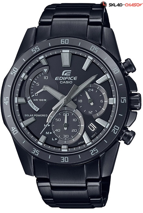 Мужские кварцевые наручные часы с хронографом (секундомером) Casio EQS-930MDC-1A на солнечной батарее. Коллекция Edifice. Калибр механизма — 5661. Срок работы аккумулятора с полным зарядом — около 5-ти месяцев. Примерный срок службы аккумулятора — 10 лет. Присутствует функция информирования о недостаточном заряде и индикатор степени заряда аккумулятора. На данной модели отображается дата и время суток (24 часа). Секундомер может отсчитывать до 9 минут 59 секунд. Стрелки и метки покрыты люминесцентным напылением (светятся в темноте). Завинчивающаяся задняя крышка. На корпус и браслет нанесено стойкое PVD покрытие. Водонепроницаемость WR100 (10 атм).