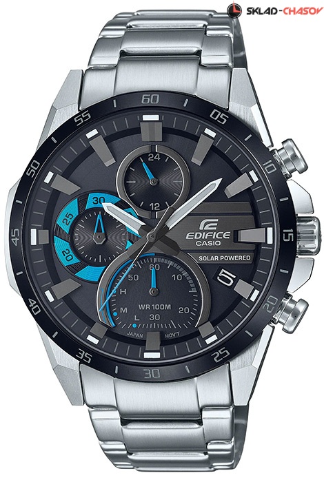 Мужские кварцевые наручные часы с хронографом (секундомером) Casio EQS-940DB-1B на солнечной батарее. Коллекция Edifice. Калибр механизма — 5585. Срок работы аккумулятора с полным зарядом — около 5-ти месяцев. Примерный срок службы аккумулятора — 10 лет. Присутствует функция информирования о недостаточном заряде и индикатор степени заряда аккумулятора. На данной модели отображается дата и время суток (24 часа). Секундомер может отсчитывать до 29 минут 59 секунд с шагом 1 сек. Стрелки и метки покрыты люминесцентным напылением (светятся в темноте). Стальной браслет. На корпус частично нанесено стойкое PVD покрытие. Завинчивающаяся задняя крышка. Водонепроницаемость WR100 (10 атм).