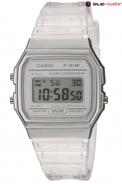 Электронные кварцевые наручные часы Casio F-91WS-7 с цифровой индикацией времени. Калибр механизма — 593. Функциональность данной модели: формат времени 12/24, автоматический календарь с установкой 28 дней на февраль, будильник, сигнал начала часа, секундомер с точностью 1/100 секунды и измерением до 59 минут 59,99 cек., диодная подсветка циферблата.