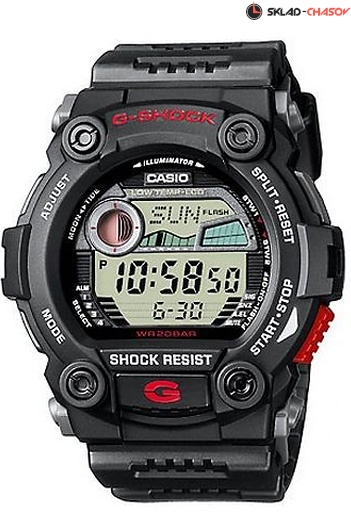 Противоударные кварцевые мужские наручные часы Casio G-7900-1 коллекции G-Shock с графиком приливов и фазой луны. Калибр механизма — 3194. Функциональность данной модели: формат времени 12/24, вечный календарь до 2099 года, функция летнего времени (DST), мировое время 48 городов (29 часовых поясов), 5 независимых будильников, сигнал начала часа, 2 секундомера с точностью 1/100 секунды и измерением до 999 часов 59 минут 59,99 cек., таймер обратного отсчета (диапазон времени 24 часа), возраст/фаза луны для определенной даты, график приливов для определенной даты/времени, электролюминесцентная подсветка циферблата с функцией авто (включается при наклоне часов на 40°), функция выключения звука кнопок (Mute). Водонепроницаемость WR200 (20 атм).