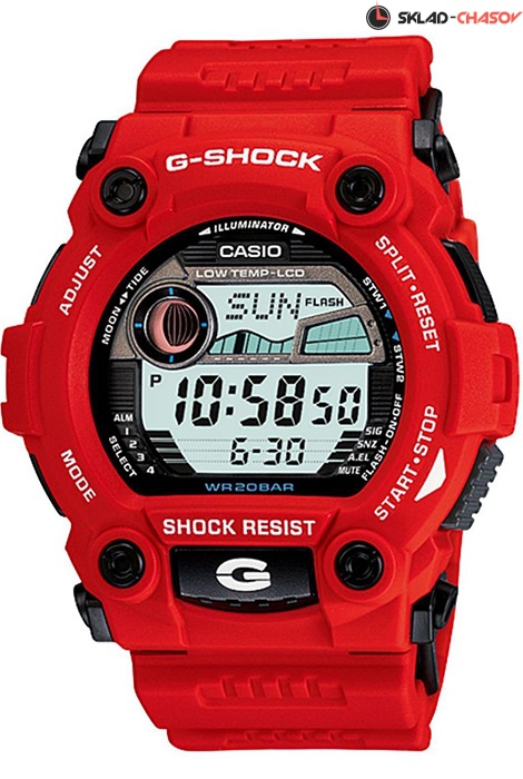Противоударные кварцевые мужские наручные часы Casio G-7900A-4 коллекции G-Shock с графиком приливов и фазой луны. Калибр механизма — 3194. Функциональность данной модели: формат времени 12/24, вечный календарь до 2099 года, функция летнего времени (DST), мировое время 48 городов (29 часовых поясов), 5 независимых будильников, сигнал начала часа, 2 секундомера с точностью 1/100 секунды и измерением до 999 часов 59 минут 59,99 cек., таймер обратного отсчета (диапазон времени 24 часа), возраст/фаза луны для определенной даты, график приливов для определенной даты/времени, электролюминесцентная подсветка циферблата с функцией авто (включается при наклоне часов на 40°) и возможностью выбора времени свечения (3 или 5 секунд), функция выключения звука нажатия кнопок (Mute). Устойчивость к низким температурам (до -20?). Водонепроницаемость WR200 (20 атм).