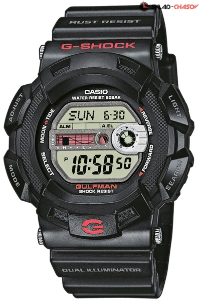 Противоударные наручные часы Casio G-9100-1 коллекции G-Shock с графиком приливов и фазой луны. Калибр механизма — 3088. Функциональность данной модели: формат времени 12/24, вечный календарь до 2099 года, функция летнего времени (DST), мировое время 48 городов (29 часовых поясов), 5 независимых будильников, сигнал начала часа, секундомер с точностью 1/100 секунды и измерением до 23 часов 59 минут 59,99 cек., таймер обратного отсчета (диапазон времени 24 часа), возраст/фаза луны для определенной даты, график приливов для определенной даты/времени, электролюминесцентная подсветка циферблата с функцией авто (включается при наклоне часов на 40°), функция выключения звука кнопок (Mute). Водонепроницаемость WR200 (20 атм).