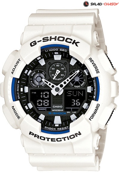 Противоударные кварцевые мужские наручные часы Casio GA-100B-7A коллекции G-Shock цифровой+стрелочной индикацией времени. Калибр механизма — 5081. Функциональность данной модели: формат времени 12/24, вечный календарь до 2099 года, функция летнего времени (DST), мировое время 48 городов (29 часовых поясов), 5 независимых будильников, сигнал начала часа, секундомер с точностью 1/1000 секунды и измерением до 99 часов 59 минут 59,99 cек., функция расчета средней скорости движения, таймер обратного отсчета (диапазон времени 24 часа), диодная подсветка циферблата с функцией авто (включается при наклоне часов на 40°). Водонепроницаемость WR200 (20 атм).