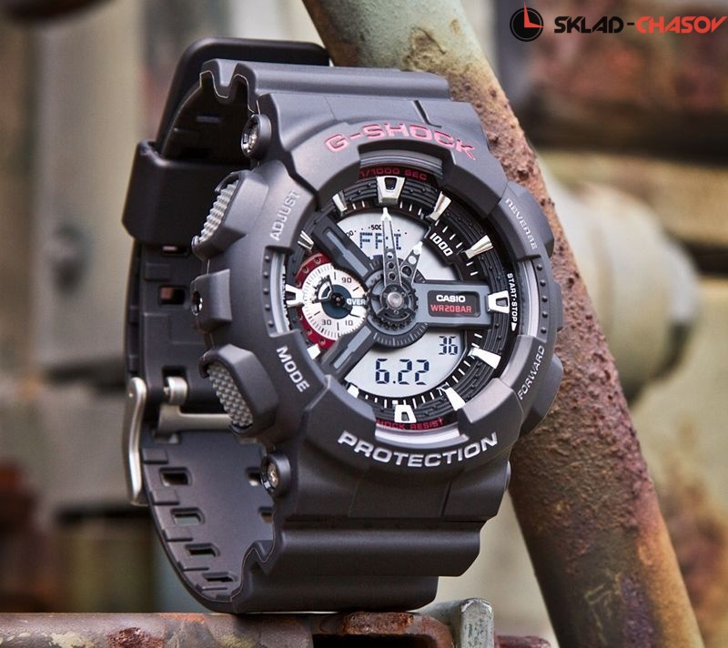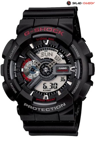 Противоударные кварцевые мужские наручные часы Casio GA-110-1A коллекции G-Shock цифровой+стрелочной индикацией времени. Калибр механизма — 5146. Функциональность данной модели: формат времени 12/24, вечный календарь до 2099 года, функция летнего времени (DST), мировое время 48 городов (29 часовых поясов), 5 независимых будильников, сигнал начала часа, секундомер с точностью 1/1000 секунды и измерением до 99 часов 59 минут 59,99 cек., функция расчета средней скорости движения, таймер обратного отсчета (диапазон времени 24 часа), диодная подсветка циферблата с функцией авто (включается при наклоне часов на 40°). Водонепроницаемость WR200 (20 атм).