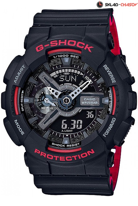 Противоударные кварцевые мужские наручные часы Casio GA-110HR-1A коллекции G-Shock цифровой+стрелочной индикацией времени. Калибр механизма — 5146. Функциональность данной модели: формат времени 12/24, вечный календарь до 2099 года, функция летнего времени (DST), мировое время 48 городов (29 часовых поясов), 5 независимых будильников, сигнал начала часа, секундомер с точностью 1/1000 секунды и измерением до 99 часов 59 минут 59,99 cек., функция расчета средней скорости движения, таймер обратного отсчета (диапазон времени 24 часа), диодная подсветка циферблата с возможностью выбора времени свечения (1.5 или 3 секунды). Стрелки покрыты необритовым (Neobrite) люминесцентным напылением (светятся в темноте). Водонепроницаемость WR200 (20 атм).
