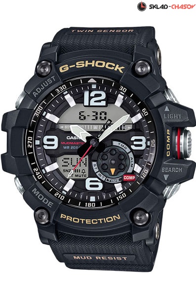 Противоударные кварцевые наручные часы Casio GG-1000-1A Mumaster коллекции G-Shock с компасом и термометром. Калибр механизма — 5476. Функциональность данной модели: формат времени 12/24, вечный календарь до 2099 года, функция летнего времени (DST), мировое время 48 городов (29 часовых поясов), 5 независимых будильников, сигнал начала часа, секундомер с точностью 1/100 секунды и измерением до 23 часов 59 минут 59,99 cек., таймер обратного отсчета (диапазон времени 60 минут), диодная подсветка циферблата с функцией авто (включается при наклоне часов на 40°), функция выключения звука кнопок (Mute). Водонепроницаемость WR200 (20 атм).