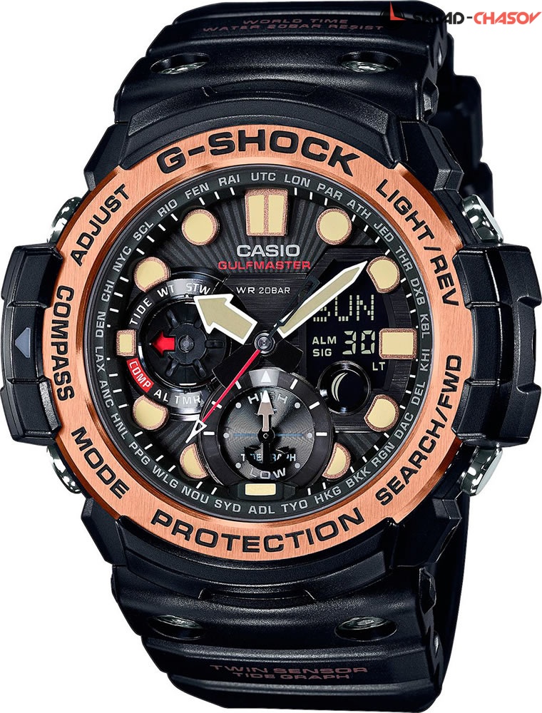 Гарантия 2 года. Противоударный корпус защищает механизм от ударов и вибрации. Светодиодная автоматическая супер-подсветка. При движении руки дисплей освещается ярким светом. Светонакопительное покрытие необрит продолжает светиться в темноте даже после непродолжительного пребывания на свету. Встроенный цифровой компас. Диапазон измерения от 0° до 359° с точностью 1°. Коррекция магнитного склонения. Встроенный датчик температуры от -10° до +60°С с точностью 0,1°C. Мировое время – 29 городов (29 часовых поясов), всемирное координированное время (UTC). Функция включения/отключения летнего времени. Отображение возраста и фазы Луны. Графическое отображение сведений о приливах и отливах на заданную дату и время. 12-ти и 24-х часовой формат времени. Секундомер с точностью показаний 1/100с и временем измерения 1ч. Сплит-хронограф. Таймер обратного отсчета от 1мин до 1ч. Функция перемещения стрелок. Функция отключения/включения звука. Стальной безель с розовым IP покрытием. 5 будильников, ежечасный сигнал. Вес: 82 г.