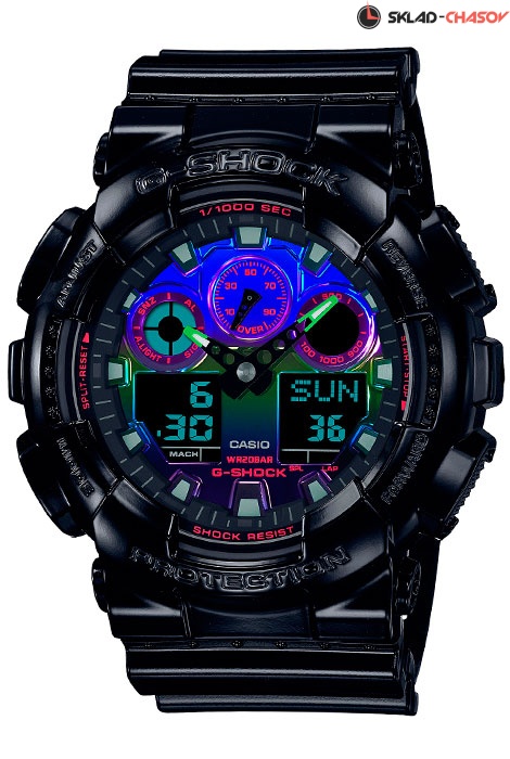 Противоударные кварцевые мужские наручные часы Casio GA-100RGB-1A коллекции G-Shock цифровой+стрелочной индикацией времени. Калибр механизма — 5081. Функциональность данной модели: формат времени 12/24, вечный календарь до 2099 года, функция летнего времени (DST), мировое время 48 городов (29 часовых поясов), 5 независимых будильников, сигнал начала часа, секундомер с точностью 1/1000 секунды и измерением до 99 часов 59 минут 59,99 cек., функция расчета средней скорости движения, таймер обратного отсчета (диапазон времени 24 часа), диодная подсветка циферблата с функцией авто (включается при наклоне часов на 40°) и возможностью выбора времени свечения (1.5 или 3 секунды). Стрелки и метки покрыты люминисцентным напылением (светятся в темноте). Инверсный дисплей. Водонепроницаемость WR200 (20 атм).