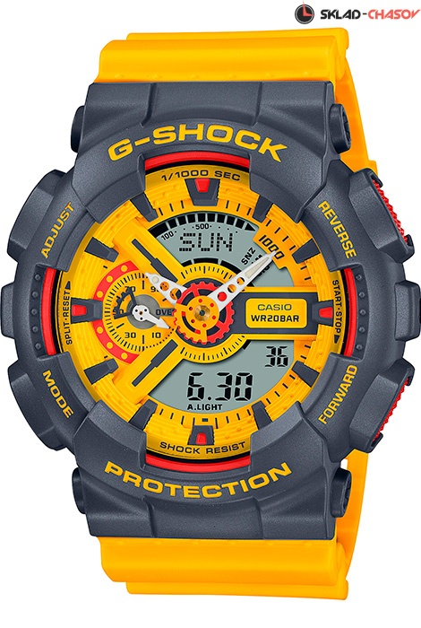 Противоударные кварцевые мужские наручные часы Casio GA-110Y-9A коллекции G-Shock цифровой+стрелочной индикацией времени. Калибр механизма — 5146. Функциональность данной модели: формат времени 12/24, вечный календарь до 2099 года, функция летнего времени (DST), мировое время 48 городов (29 часовых поясов), 5 независимых будильников, сигнал начала часа, секундомер с точностью 1/1000 секунды и измерением до 99 часов 59 минут 59,99 cек., функция расчета средней скорости движения, таймер обратного отсчета (диапазон времени 24 часа), диодная подсветка циферблата с функцией авто (включается при наклоне часов на 40°) и возможностью выбора времени свечения (1.5 или 3 секунды). Стрелки покрыты люминисцентным напылением (светятся в темноте). Водонепроницаемость WR200 (20 атм).