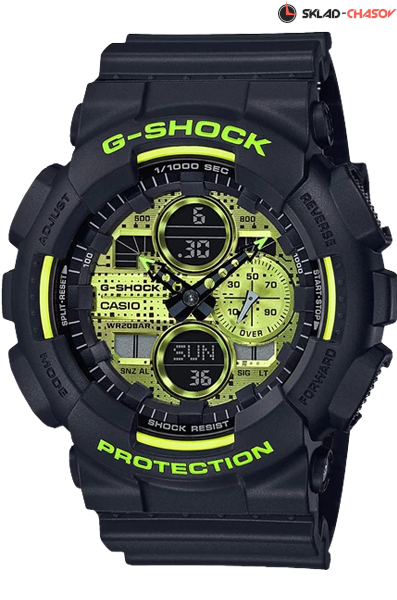 Противоударные кварцевые мужские наручные часы Casio GA-140DC-1A коллекции G-Shock цифровой+стрелочной индикацией времени. Калибр механизма — 5612. Функциональность данной модели: формат времени 12/24; вечный календарь; функция летнего времени (DST); функция мирового времени; 5 независимых будильников; сигнал начала часа; секундомер с точностью 1/1000 секунды и измерением до 99 часов 59 минут 59,99 cек.; функция расчета средней скорости движения; таймер обратного отсчета (диапазон времени 24 часа); диодная подсветка циферблата с функцией авто (включается при наклоне часов на 40°). Водонепроницаемость WR200 (20 атм).