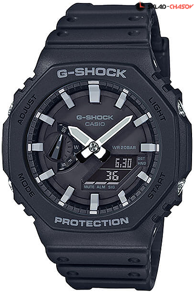 Противоударные кварцевые мужские наручные часы Casio GA-2100-1A коллекции G-Shock с цифровой+стрелочной индикацией времени. Тонкий корпус для данной коллекции — 11.8 мм. Калибр механизма — 5611. Корпус усилен углеродным волокном. Функциональность данной модели: формат времени 12/24, вечный календарь до 2099 года, функция летнего времени (DST), мировое время 48 городов (29 часовых поясов), 5 независимых будильников, сигнал начала часа, секундомер с точностью 1/100 секунды и измерением до 23 часов 59 минут 59 cек., таймер обратного отсчета (диапазон времени 24 часа), диодная подсветка циферблата, функция выключения звука кнопок (Mute), смещение стрелок для удобного просмотра информации на цифровом экране. Водонепроницаемость WR200 (20 атм).