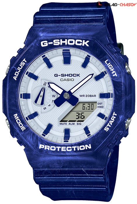 Противоударные кварцевые мужские наручные часы Casio GA-2100BWP-2A коллекции G-Shock с цифровой+стрелочной индикацией времени. Тонкий корпус для данной коллекции — 11.8 мм. Калибр механизма — 5611. Корпус усилен углеродным волокном, изготовленным по технологии Carbon Core Guard. Функциональность данной модели: формат времени 12/24, вечный календарь до 2099 года, функция летнего времени (DST), мировое время 48 городов (29 часовых поясов), 5 независимых будильников, сигнал начала часа, секундомер с точностью 1/100 секунды и измерением до 23 часов 59 минут 59 cек., таймер обратного отсчета (диапазон времени 24 часа), диодная подсветка циферблата, функция выключения звука кнопок (Mute), смещение стрелок для удобного просмотра информации на цифровом экране. Водонепроницаемость WR200 (20 атм).