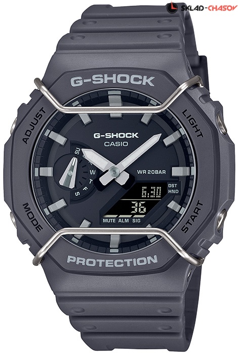 Противоударные кварцевые наручные часы Casio GA-2100PTS-8A коллекции G-Shock с цифровой+стрелочной индикацией времени. Калибр механизма — 5611. Корпус усилен углеродным волокном, изготовленным по технологии Carbon Core Guard + металличекий защитный каркас, защищающий стекло от повреждений. Функциональность данной модели: формат времени 12/24, вечный календарь до 2099 года, функция летнего времени (DST), мировое время 48 городов (31 часовом поясе), двойное время, 5 независимых будильников, сигнал начала часа, секундомер с точностью 1/100 секунды и измерением до 23 часов 59 минут 59 cек., таймер обратного отсчета (диапазон времени 24 часа), двойная диодная подсветка циферблата с возможностью выбора времени свечения (1.5 или 3 секунды) + необритовое (Neobrite) покрытие на стрелках и метках для длительного послесвечения в темноте, функция выключения звука нажатия кнопок (Mute), функция смещения стрелок для удобного просмотра информации на цифровом экране. Водонепроницаемость WR200 (20 атм).