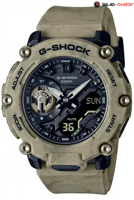 Противоударные кварцевые наручные часы Casio GA-2200SL-5A коллекции G-Shock с цифровой+стрелочной индикацией времени. Калибр механизма — 5674. Корпус усилен углеродным волокном, изготовленным по технологии Carbon Core Guard. Функциональность данной модели: формат времени 12/24, вечный календарь до 2099 года, функция летнего времени (DST), мировое время 48 городов (31 часовом поясе), двойное время, 5 независимых будильников, сигнал начала часа, секундомер с точностью 1/100 секунды и измерением до 23 часов 59 минут 59 cек., таймер обратного отсчета (диапазон времени 24 часа), двойная диодная подсветка циферблата с возможностью выбора времени свечения (1.5 или 3 секунды) + необритовое (Neobrite) покрытие на стрелках и метках для длительного послесвечения в темноте, функция выключения звука нажатия кнопок (Mute), функция смещения стрелок для удобного просмотра информации на цифровом экране. Водонепроницаемость WR200 (20 атм).