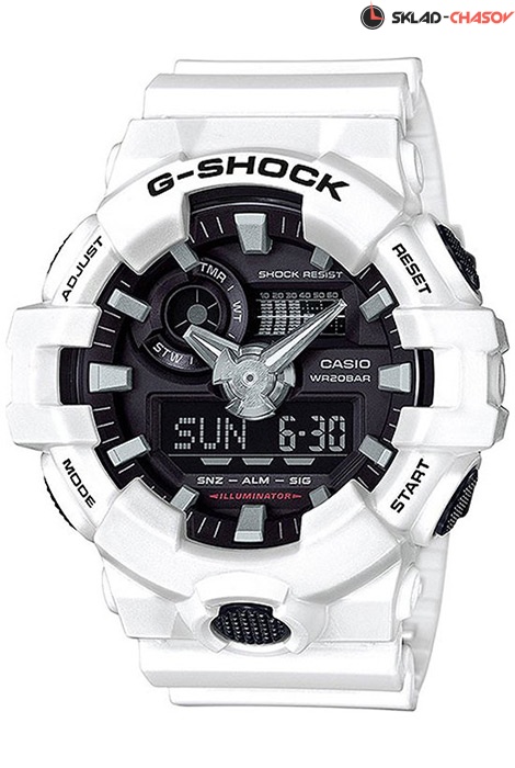 Противоударные кварцевые мужские наручные часы Casio GA-700-7A коллекции G-Shock цифровой+стрелочной индикацией времени. Калибр механизма — 5522. Функциональность данной модели: формат времени 12/24, вечный календарь до 2099 года, функция летнего времени (DST), мировое время 48 городов (31 часовой пояс), 5 независимых будильников, сигнал начала часа, секундомер с точностью 1/100 секунды и измерением до 23 часов 59 минут 59,99 cек., таймер обратного отсчета (диапазон времени 60 минут), диодная подсветка циферблата (Super Illuminator) с возможностью выбора времени свечения (1.5 или 3 секунды) + необритовое (Neobrite) покрытие на стрелках для длительного послесвечения в темноте, функция выключения звука кнопок (Mute). Функция сдвига стрелок в нейтральное положение для удобства обзора цифровой индикации. Водонепроницаемость WR200 (20 атм).