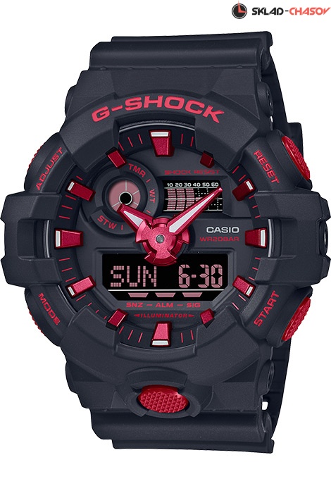 Противоударные кварцевые мужские наручные часы Casio GA-700BNR-1A коллекции G-Shock цифровой+стрелочной индикацией времени. Калибр механизма — 5522. Функциональность данной модели: формат времени 12/24, вечный календарь до 2099 года, функция летнего времени (DST), мировое время 48 городов (31 часовой пояс), 5 независимых будильников, сигнал начала часа, секундомер с точностью 1/100 секунды и измерением до 23 часов 59 минут 59,99 cек., таймер обратного отсчета (диапазон времени 60 минут), диодная подсветка циферблата (Super Illuminator) с возможностью выбора времени свечения (1.5 или 3 секунды) + необритовое (Neobrite) покрытие на стрелках для длительного послесвечения в темноте, функция выключения звука кнопок (Mute). Функция сдвига стрелок в нейтральное положение для удобства обзора цифровой индикации. Водонепроницаемость WR200 (20 атм).