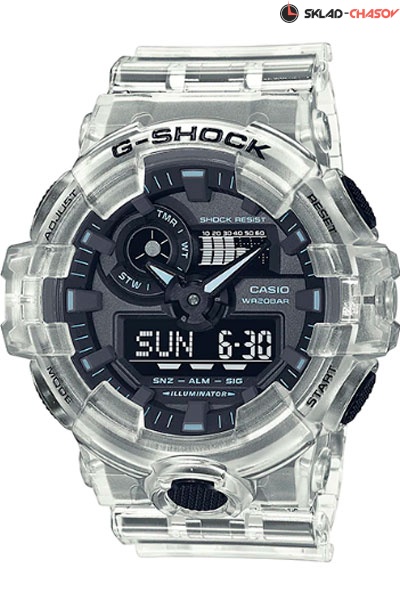 Противоударные кварцевые мужские наручные часы Casio GA-700SKE-7A коллекции G-Shock цифровой+стрелочной индикацией времени. Калибр механизма — 5522. Функциональность данной модели: формат времени 12/24, вечный календарь до 2099 года, функция летнего времени (DST), мировое время 48 городов (31 часовой пояс), 5 независимых будильников, сигнал начала часа, секундомер с точностью 1/100 секунды и измерением до 23 часов 59 минут 59,99 cек., таймер обратного отсчета (диапазон времени 60 минут), сверхъяркая диодная подсветка циферблата с возможностью выбора времени свечения (1.5 или 3 секунды), функция выключения звука кнопок (Mute). Функция сдвига стрелок в нейтральное положение для удобства обзора цифровой индикации. Водонепроницаемость WR200 (20 атм).