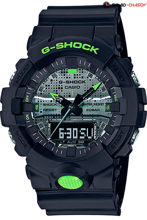Противоударные кварцевые мужские наручные часы Casio GA-800DC-1A коллекции G-Shock цифровой+стрелочной индикацией времени. Калибр механизма — 5535. Функциональность данной модели: формат времени 12/24, вечный календарь до 2099 года, функция летнего времени (DST), функция двойного времени, 5 независимых будильников, сигнал начала часа, секундомер с точностью 1/100 секунды и измерением до 23 часов 59 минут 59,99 cек., записная книжка для результатов секундомера на 120 записей, таймер обратного отсчета (диапазон времени 100 минут), двойная диодная подсветка циферблата с функцией авто (включается при наклоне часов на 40°) и возможностью выбора времени свечения (1.5 или 3 секунды) + необритовое (Neobrite) люминесцентное напыление на стрелках часов, функция выключения звука кнопок (Mute). Функция сдвига стрелок в нейтральное положение для удобства обзора цифровой индикации. Водонепроницаемость WR200 (20 атм).