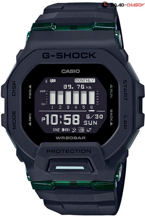 Противоударные кварцевые мужские наручные часы Casio GBD-200UU-1E коллекции G-Shock с цифровой индикацией времени, функцией шагомера и технологией Bluetooth® Smart. Калибр механизма — 3506. С помощью Bluetooth® вы можете подключить часы к смартфону и с помощью приложения G-SHOCK Move® получить доступ к полезным функциям. Часы автоматически связываются с телефоном через Bluetooth® и проверяют точность времени 4 раза в сутки. Просмотр количества шагов за 24 часа, интенсивность упражнений и физических нагрузок. Просмотр еженедельного количества шагов и числа сожженных калорий. Просмотр информации секундомера о времени прохождения кругов или промежуточных результатах (до 100 записей). Настройка мирового времени (300 городов). Функция поиска телефона, можно включить тоновый сигнал на телефоне, что позволит быстро найти телефон. Функциональность данной модели: формат времени 12/24, вечный календарь до 2099 года, мировое время в 38 городах (38 часовых поясов); функция летнего времени (DST), функция двойного времени, 4 независимых будильника, сигнал начала часа, секундомер с измерением до 100 часов, память на 100 кругов (100 записей), 5 независимых таймеров обратного отсчета (диапазон времени 60 минут), диодная подсветка циферблата с функцией авто (включается при наклоне часов на 40°) и возможностью выбора времени свечения (1.5 или 3 секунды), режим выключения звука нажатия кнопок (Mute), режим энергосбережения (дисплей гаснет для экономии энергии на 3 часа каждый день), режим полета (авиа режим), функция тренировки: отображение расстояния, скорости, темпа и других расчетных значений на основе акселерометра, автоматическое / ручное время прохождения круга, автоматическая пауза, вкл/выкл оповещения о цели (время, потраченные калории), настройка дисплея тренировки (прошедшее время, дистанция, темп, время прохождения круга, дистанция круга, темп круга,средний темп, скорость, средняя скорость, сожженные калории). Журнал тренировок: ежедневное отображение данных (количество шагов), ежемесячное отображение данных (пробег), данные о тренировках (до 100 пробежек, до 140 кругов за пробежку), затраченное время, дистанция, темп, сожженные калории. Уведомления с функцией вибро о новых/пропущенных звонках, сообщениях, email письмах и напоминаний из расписания. Водонепроницаемость WR200 (20 атм).