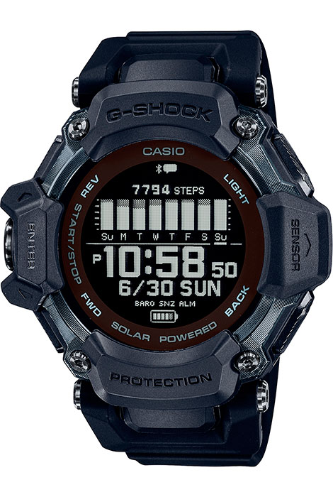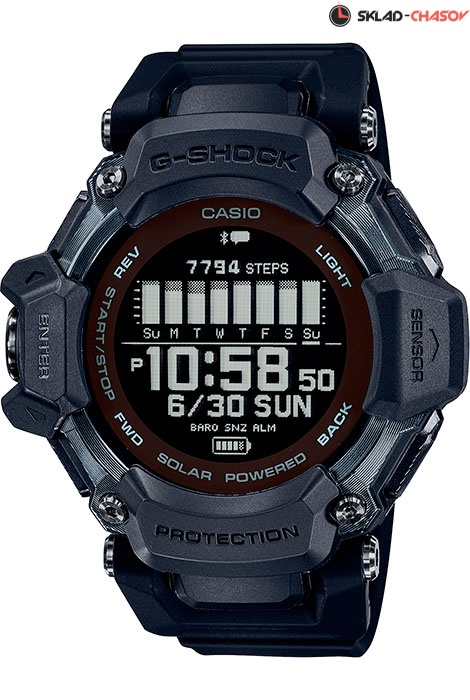 Противоударные кварцевые мужские наручные часы на солнечной батарее Casio GBD-H2000-1B коллекции G-Shock с цифровой индикацией времени, функцией шагомера и технологией Bluetooth® Smart. Калибр механизма — 3515. Аккумулятор данной модели заряжается от любого источника света + зарядка от любого источника с подключением по USB (тип А). Срок работы аккумулятора при спользовании функций активности (GPS, частота сердечных сокращений) с высокой частотой обновления (непрерывный прием): прибл. максимум 14 часов, с нормальной частотой обновления (непрерывный прием): прибл. максимум 16 часов, с редкой частотой обновления (прерывистый прием): прибл. максимум 19 часов. Использование в режиме часов с выключенным измерением частоты сердечных сокращений: прибл. 2 месяца использования с включенной функцией энергосбережения: прибл. 23 месяца. Примерный срок службы аккумулятора — 10 лет. Имеется режим энергосбережения (дисплей гаснет для экономии энергии, когда часы остаются в темноте) и индикатор уровня заряда батареи.