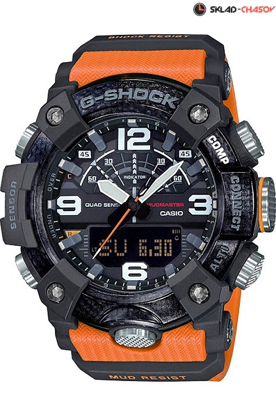 Противоударные кварцевые наручные часы Casio GG-B100-1A9 Mudmaster с технологией Bluetooth® коллекции G-Shock с компасом, термометром, высотомером, барометром и шагомером. Калибр механизма — 5594. С помощью Bluetooth® и специального приложения G-SHOCK Connected вы сможете подключить часы к смартфону и получить доступ к полезным функциям. Часы автоматически связываются с телефоном через Bluetooth® и проверяют точность времени 4 раза в сутки. Возможности приложения G-SHOCK Connected в данной модели: просмотр данных шагомера (количество шагов и физическая нагрузка за последние 24 часа; еженедельное количество шагов; число сожженных калорий); запись в память часов текущего местоположения или проверка расстояния и направления до данной точки; запись маршрутных точек и их высот; установка времени в конкретном городе (300 городов); включение/выключение летнего времени (DST); функция поиска телефона, можно включить тоновый сигнал на телефоне, что позволит быстро найти телефон. Управление настройками часов: установка точного текущего времени; установка будильника; подстройка положения стрелок; управление таймером, компасом, альтиметром (высотомером) и барометром. Функциональность данной модели: вечный календарь; цифровой компас; альтиметр (высотомер) с записью данных (14 записей); барометр с построением гарфика изменения атмосферного давления и выбором единиц измерения (гектопаскали или дюймы ртутного столба); термометр с диапазоном измерений от -10,0 °C до 60,0 °C (от 14,0 °F до 140,0 °F); просмотр времени восхода/заката солнца с возможностью поиска информации на конкретную дату; секундомер с измерением до 23 часов 59 минут 59,99 cек.; таймер обратного отсчета (диапазон времени 24 часов); 5 независимых будильников; сигнал начала часа; мировое время - 38 часовых поясов (38 городов + всемирное координированное время); шагомер; функция выключения звука нажатия кнопок (Mute); двойная диодная подсветка циферблата с функцией авто (включается при наклоне часов на 40°) и возможностью выбора времени свечения (1.5 или 3 секунды)+ необритовое (Neobrite) покрытие на стрелках и метках для длительного послесвечения в темноте; функция перемещения стрелок (помогает определить значения в окошках с цифровой индикацией, когда стрелки их закрывают). Дополнительная защита от пыли. Усиленный углеродными волокнами (Карбон) пластиковый корпус, изготовленный по технологии Carbon Core Guard . Водонепроницаемость WR200 (20 атм).