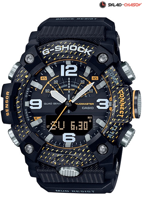 Противоударные кварцевые наручные часы Casio GG-B100Y-1A Mudmaster с технологией Bluetooth® коллекции G-Shock с компасом, термометром, высотомером, барометром и шагомером. Калибр механизма — 5594. С помощью Bluetooth® и специального приложения G-SHOCK Connected вы сможете подключить часы к смартфону и получить доступ к полезным функциям. Часы автоматически связываются с телефоном через Bluetooth® и проверяют точность времени 4 раза в сутки. Возможности приложения G-SHOCK Connected в данной модели: просмотр данных шагомера (количество шагов и физическая нагрузка за последние 24 часа; еженедельное количество шагов; число сожженных калорий); запись в память часов текущего местоположения или проверка расстояния и направления до данной точки; запись маршрутных точек и их высот; установка времени в конкретном городе (300 городов); включение/выключение летнего времени (DST); функция поиска телефона, можно включить тоновый сигнал на телефоне, что позволит быстро найти телефон. Управление настройками часов: установка точного текущего времени; установка будильника; подстройка положения стрелок; управление таймером, компасом, альтиметром (высотомером) и барометром. Функциональность данной модели: вечный календарь; цифровой компас; альтиметр (высотомер) с записью данных (14 записей); барометр с построением гарфика изменения атмосферного давления и выбором единиц измерения (гектопаскали или дюймы ртутного столба); термометр с диапазоном измерений от -10,0 °C до 60,0 °C (от 14,0 °F до 140,0 °F); просмотр времени восхода/заката солнца с возможностью поиска информации на конкретную дату; секундомер с измерением до 23 часов 59 минут 59,99 cек.; таймер обратного отсчета (диапазон времени 24 часов); 5 независимых будильников; сигнал начала часа; мировое время - 38 часовых поясов (38 городов + всемирное координированное время); шагомер; функция выключения звука нажатия кнопок (Mute); двойная диодная подсветка циферблата с функцией авто (включается при наклоне часов на 40°) и возможностью выбора времени свечения (1.5 или 3 секунды)+ необритовое (Neobrite) покрытие на стрелках и метках для длительного послесвечения в темноте; функция перемещения стрелок (помогает определить значения в окошках с цифровой индикацией, когда стрелки их закрывают). Дополнительная защита от пыли. Усиленный углеродными волокнами (Карбон) пластиковый корпус, изготовленный по технологии Carbon Core Guard . Водонепроницаемость WR200 (20 атм).