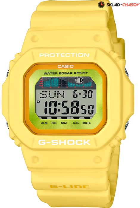Противоударные кварцевые наручные часы Casio GLX-5600RT-9 коллекции G-Shock с графиком приливов и фазой луны. Калибр механизма — 3151. Функциональность данной модели: формат времени 12/24, вечный календарь до 2099 года, функция летнего времени (DST), мировое время 48 городов (29 часовых поясов), 3 независимых будильников, сигнал начала часа, секундомер с точностью 1/100 секунды и измерением до 23 часов 59 минут 59,99 cек., таймер обратного отсчета (диапазон времени 24 часа), возраст/фаза луны для определенной даты, график приливов для определенной даты/времени, электролюминесцентная подсветка циферблата с функцией авто (включается при наклоне часов на 40°), функция выключения звука нажатия кнопок (Mute). Водонепроницаемость WR200 (20 атм).