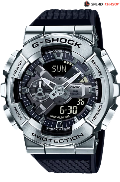 Противоударные кварцевые наручные часы Casio GM-110-1A коллекции G-Shock. Калибр механизма — 5553. Функциональность данной модели: формат времени 12/24, вечный календарь до 2099 года, функция летнего времени (DST), мировое время 48 городов (31 часовой пояс), 5 независимых будильников, сигнал начала часа, секундомер с точностью 1/100 секунды и измерением до 999 часов 59 минут 59,99 cек., таймер обратного отсчета (диапазон времени 24 часа). Диодная подсветка циферблата с функцией авто (включается при наклоне часов на 40°). функция выключения звука кнопок (Mute). Водонепроницаемость WR200 (20 атм).