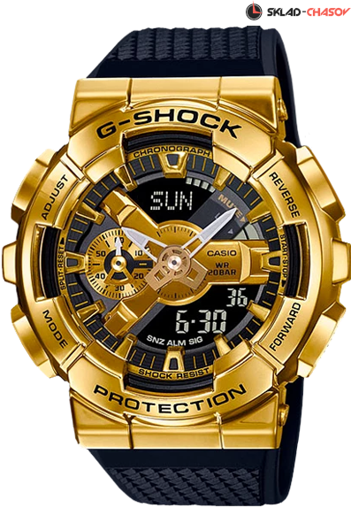 Противоударные кварцевые наручные часы Casio GM-110G-1A9 коллекции G-Shock. Калибр механизма — 5553. Функциональность данной модели: формат времени 12/24, вечный календарь до 2099 года, функция летнего времени (DST), мировое время 48 городов (31 часовой пояс), 5 независимых будильников, сигнал начала часа, секундомер с точностью 1/100 секунды и измерением до 999 часов 59 минут 59,99 cек., таймер обратного отсчета (диапазон времени 24 часа). Диодная подсветка циферблата с функцией авто (включается при наклоне часов на 40°). функция выключения звука кнопок (Mute). На корпус часов нанесено стойкое PVD покрытие. Водонепроницаемость WR200 (20 атм).