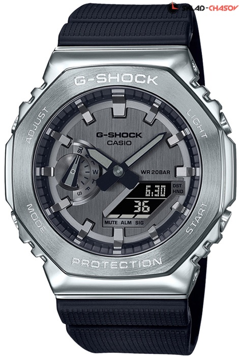 Противоударные кварцевые наручные часы Casio GM-2100-1A коллекции G-Shock с цифровой+стрелочной индикацией времени. Тонкий корпус для данной коллекции — 11.8 мм. Калибр механизма — 5611. Стальной корпус, дополнительно усилен углеродным волокном, изготовленным по технологии Carbon Core Guard. Функциональность данной модели: формат времени 12/24, вечный календарь до 2099 года, функция летнего времени (DST), мировое время 48 городов (31 часовой пояс), 5 независимых будильников, сигнал начала часа, секундомер с точностью 1/100 секунды и измерением до 59 минут 59 cек., таймер обратного отсчета (диапазон времени 24 часа), двойная диодная подсветка циферблата c возможностью выбора времени свечения (1.5 или 3 секунды) + необритовое (Neobrite) покрытие на стрелках для длительного послесвечения в темноте, функция выключения звука нажатия кнопок (Mute), функция смещения стрелок для удобного просмотра информации на цифровом экране. На корпус нанесено стойкое PVD покрытие. Полимерный ремешок. Водонепроницаемость WR200 (20 атм).
