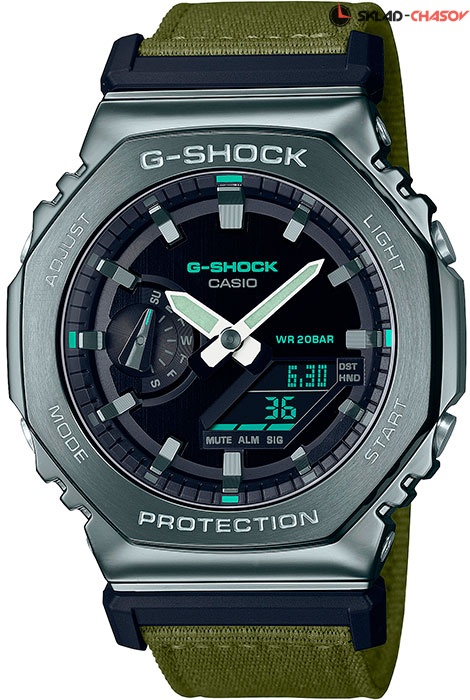 Противоударные кварцевые наручные часы Casio GM-2100CB-3A коллекции G-Shock с цифровой+стрелочной индикацией времени. Тонкий корпус для данной коллекции — 11.8 мм. Калибр механизма — 5611. Стальной корпус, дополнительно усилен углеродным волокном, изготовленным по технологии Carbon Core Guard. Функциональность данной модели: формат времени 12/24, вечный календарь до 2099 года, функция летнего времени (DST), мировое время 48 городов (31 часовой пояс), 5 независимых будильников, сигнал начала часа, секундомер с точностью 1/100 секунды и измерением до 59 минут 59 cек., таймер обратного отсчета (диапазон времени 24 часа), двойная диодная подсветка циферблата c возможностью выбора времени свечения (1.5 или 3 секунды) + необритовое (Neobrite) покрытие на стрелках для длительного послесвечения в темноте, функция выключения звука нажатия кнопок (Mute), функция смещения стрелок для удобного просмотра информации на цифровом экране. На корпус нанесено стойкое PVD покрытие. Текстильный ремешок. Водонепроницаемость WR200 (20 атм).
