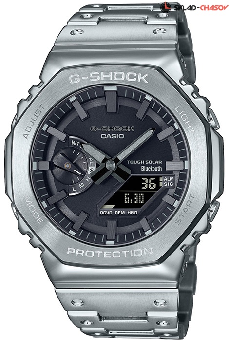 Мужские противоударные кварцевые наручные часы японского производства на солнечной батарее Casio GM-B2100D-1 коллекции G-Shock с цифровой+стрелочной индикацией времени с модулем Bluetooth® Smart. Калибр механизма — 5691. Аккумулятор данной модели заряжается от любого источника света. Срок работы аккумулятора с полным зарядом — около 6-ти месяцев. Примерный срок службы аккумулятора — не менее 10 лет. Корпус выполнен из нержавеющей стали. С помощью Bluetooth® вы можете подключить часы к смартфону и с помощью приложения CASIO WATCHES получить доступ к полезным функциям. Часы автоматически связываются с телефоном через Bluetooth® и проверяют точность времени 4 раза в сутки. Функция поиска телефона, можно включить тоновый сигнал на телефоне, что позволит быстро найти телефон. Настройка и управление таймером, секундомером и будильником. Можно проверить уровень заряда аккумулятора. Функциональность данной модели: формат времени 12/24, вечный календарь до 2099 года, возможность установки индикации дня недели на Русский язык, функция летнего времени (DST), мировое время 38 городов (38 часовых поясов), 5 независимых будильников, сигнал начала часа, секундомер с точностью 1/100 секунды и измерением до 59 минут 59 cек., таймер обратного отсчета (диапазон времени 60 минут) с шагом 1 сек., двойная диодная подсветка циферблата с возможностью выбора времени свечения (1.5 или 3 секунды), функция выключения звука кнопок (Mute), возможность отображения дня недели на нескольких языках, функция смещения стрелок для удобного просмотра информации на цифровом экране, функция поиска телефона (при нажатии кнопки на ваших часах смартфон подает звуковой сигнал). Стрелки покрыты необритовым (Neobrite) люминесцентным напылением (светятся в темноте). Модуль часов снабжен элементами из материала alphaGEL, который еще лучше защищает часы от сотрясения и вибрации. AlphaGEL представляет собой гибкую силиконовую прослойку, оказывающую амортизирующий эффект. Завинчивающаяся задняя крышка часов. Литой стальной браслет. Водонепроницаемость WR200 (20 атм). Японская сборка (Made In Japan).