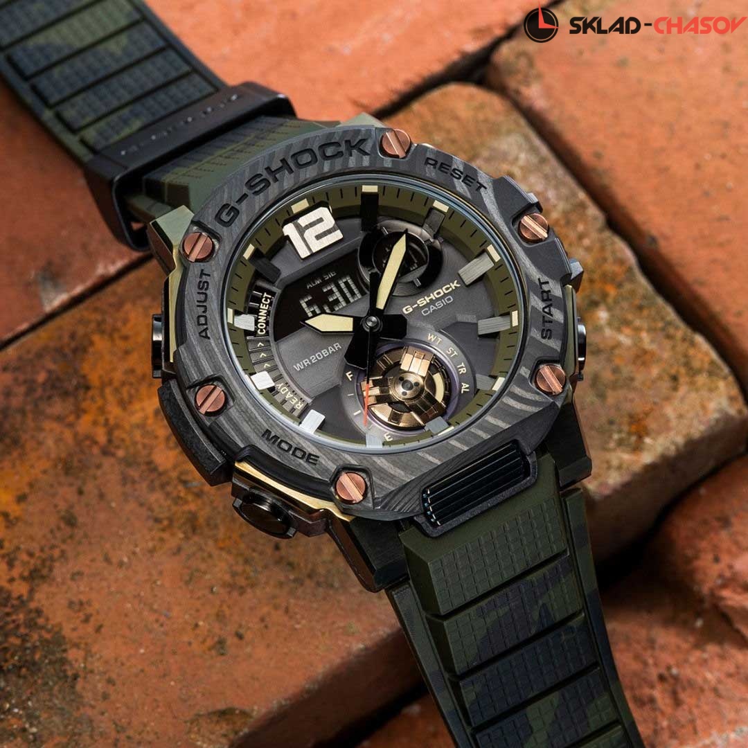 Новинка от Casio порадует вам своей прочностью и точностью. Время для новых приключений. G-Steel. Питание от солнечной энергии Tough Solar - солнечные батарейки большой мощности, индикатор заряда батареи. Функция автоматического сохранения энергии. Время работы аккумулятора без подзарядки приблизительно 6 месяцев, при включенной функции сохранения энергии приблизительно 19 месяцев. Противоударный корпус защищает механизм от ударов и вибрации. Ударопрочная конструкция Carbon Core Guard объединяет корпус и заднюю крышку в единый карбоновый моноблок. Двойная подcветка: лицо и циферблат подсвечиваются ярким светодиодом при недостаточном освещении, во время поворота запястья подсветка включается автоматически. Послесвечение. Необритовое светонакопительное покрытие обеспечивает длительное послесвечение в темноте даже после кратковременного нахождения на свету. 12-ти и 24-х часовой формат времени. Секундомер с точностью показаний 1/1000с (до 1ч) и 1/10с (после 1ч) и временем измерения 24ч. SPLIT-хронограф. Таймер обратного отсчета от 1сек до 24ч. Мировое время – 39 городов (39 часовых поясов), всемирное координированное время (UTC). Автоматический переход на зимнее и летнее время, возможность включения/отключения данной функции. Беспроводная технология Bluetooth® 4.0 со сверхнизким потреблением энергии для синхронизации со смартфоном. Автоматическое подключение к серверу времени через смартфон для корректировки текущего и настроек мирового времени. Типы сигналов: ежедневный, ежемесячный, каждый день определенного месяца, на определенную дату. Функции перемещения стрелок для беспрепятственного просмотра информации на дисплее, отключения/включения звука, поиска телефона. Карбоновый безель. Заводная головка с защитой. Водонепроницаемость в соответствии с ISO 2281. Ремешок с классической застежкой.
