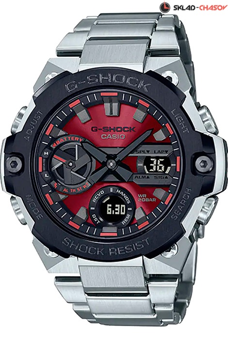 Противоударные кварцевые наручные часы на солнечной батарее Casio GST-B400AD-1A4 коллекции G-Shock с модулем Bluetooth Smart. Калибр механизма — 5657. Аккумулятор данной модели заряжается от любого источника света. Срок работы аккумулятора с полным зарядом — около 5-ти месяцев. Примерный срок службы аккумулятора — 10 лет. Имеется режим энергосбережение (дисплей гаснет для экономии энергии, когда часы остаются в темноте) и индикатор уровня заряда батареи. С помощью технологии Bluetooth Smart данная модель имеет возможность поддерживать связь с системами IOS и Android. Возможности Bluetooth в данной модели: c помощью специального приложения G-SHOCK Connected возможно установить время в конкретном городе (300 городов), время будильника, воспользоваться секундомером, установить точное текущее время, а также в случае потери смартфона возможно воспроизвести на нем сигнал. Функциональность данной модели: отображение времени в 12-часовом или 24-часовом формате; режим сохранения энергии; индикатор уровня заряда аккумулятора; индикация даты и дня недели; возможность установки индикации дня недели на русском языке; ежедневная автоматическая корректировка точного времени по Bluetooth (4 раза в сутки); вечный календарь до 2099 года; 5 независимых будильников; сигнал начала часа; мировое время в 38 городах (38 часовых поясов); функция летнего времени (DST); секундомер с точностью 1/100 секунды и измерением до 23 часов 59 минут 59 cек.; таймер обратного отсчета до 60 минут; функция перемещения стрелок (помогает определить значения в окошке с цифровой индикацией, когда стрелки его закрывают); двойная диодная подсветка циферблата с возможностью выбора времени свечения (1.5 или 3 секунды) + необритовое (Neobrite) покрытие на стрелках для длительного послесвечения в темноте; функция поиска телефона - можно включить тоновый сигнал на телефоне, что позволит быстро найти телефон; режим выключения звука нажатия кнопок (Mute). Пластиковый корпус в оболочке из нержавеющей стали, дополнительно усиленный углеродным волокном, изготовленным по технологии Carbon Core Guard. Браслет из нержавеющей стали. На корпус частично нанесено стойкое PVD покрытие. Водонепроницаемость WR200 (20 атм).